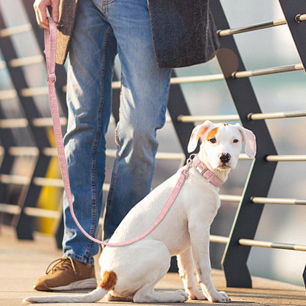 This charming Rosy Paws Luxe Set features a soft pastel cotton fabric and a custom-engraved metal buckle. It's super light and comes in three collar sizes plus four trendy colors to match your pet’s unique style.